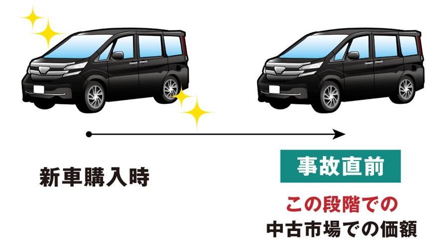 これは、事故発生時点での中古車市場における適正価格をベースに計算された金額で、年式や走行距離、修復歴などによって相場が変わり、新車購入価格より下がるのが一般的です。