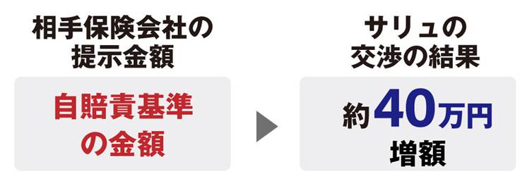 | 交渉の経緯 | 提示されていた慰謝料の金額が自賠責基準であり、適正な金額ではないため弁護士が交渉。 相手方保険会社が裁判基準満額の慰謝料を認め、当初提示されていた金額から約40万円の増額に成功 |