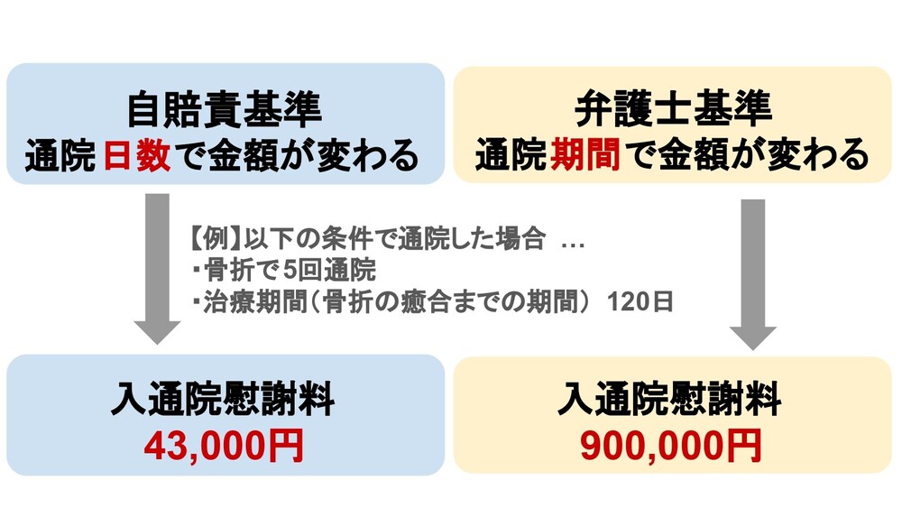 ただし、通院日数が少ないときの交通事故の慰謝料は、日数ベースの「自賠責基準」なのか、期間ベースの「弁護士基準」なのかによって、金額が大幅に変わります。