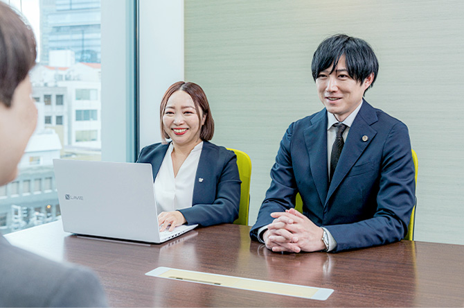 お客様お一人に対し、経験・知識豊富な弁護士とリーガルスタッフが2名体制でサポートいたします。弁護士が不在の時も、ご質問やご相談に即時対応することができるため、少しでも早くお客様のご不安を解消させていただくことが可能です。