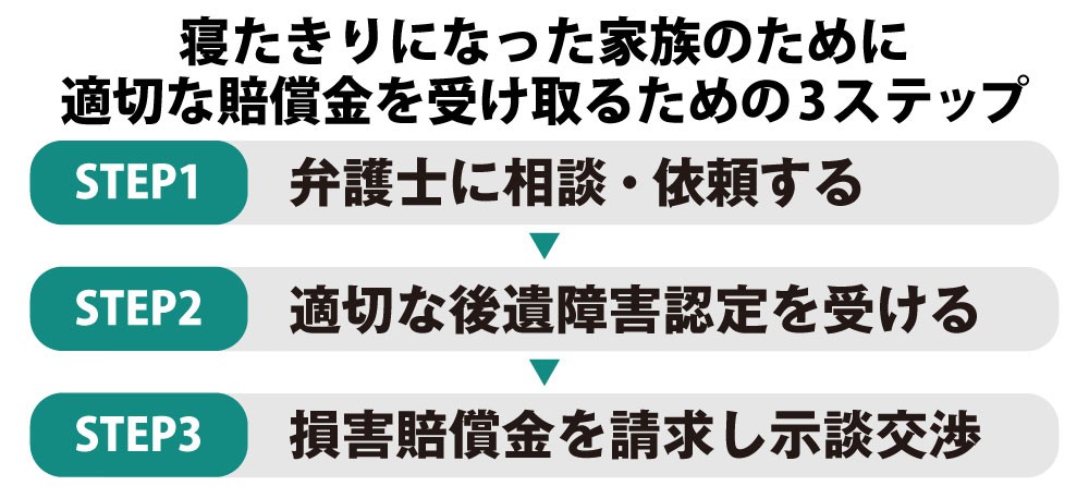 ◯寝たきりになった家族のために適切な賠償金を受け取る方法は下記の3ステップ