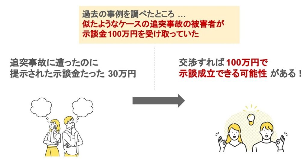 これにより、事故の状況や怪我の程度が近い被害者がどれくらいの示談金を受け取っているか、理解できます。