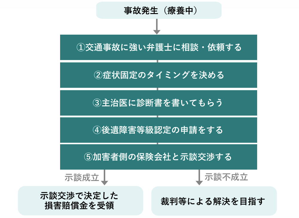 | STEP1.交通事故に強い弁護士に相談・依頼する STEP2.症状固定のタイミングを決め主治医に診断書を書いてもらう STEP3.後遺障害を申請する STEP4.加害者側の保険会社と示談交渉する →すべての手続を自力で行うのは難しいため、弁護士のサポートを受けながら行う |