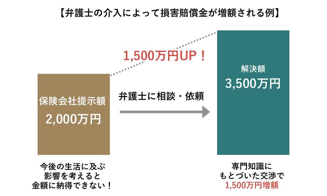 賠償金相場は症状の重さやその後の生活への影響によって異なりますが、実際に「加害者側の保険会社から持ちかけられた賠償金の金額があまりに低すぎて不審に思い、弁護士に依頼したところ1,000万円以上もの増額が実現した」といったケースは少なくありません。