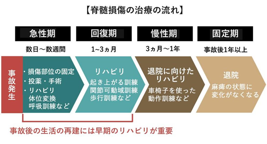 バイク事故で脊髄損傷を負い病院に運ばれたとき、次のような流れで治療が進められます。