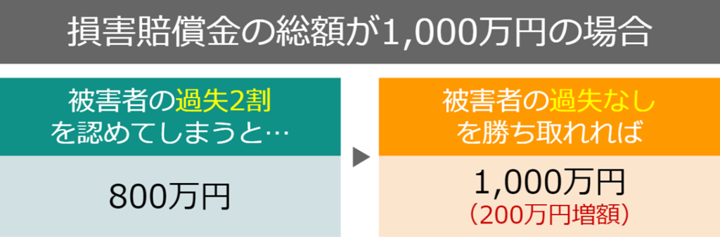 例えば、損害賠償金の合計が1,000万円だった場合、被害者の過失割合を1割でも認めさせれば、加害者側は100万円を減額できます。