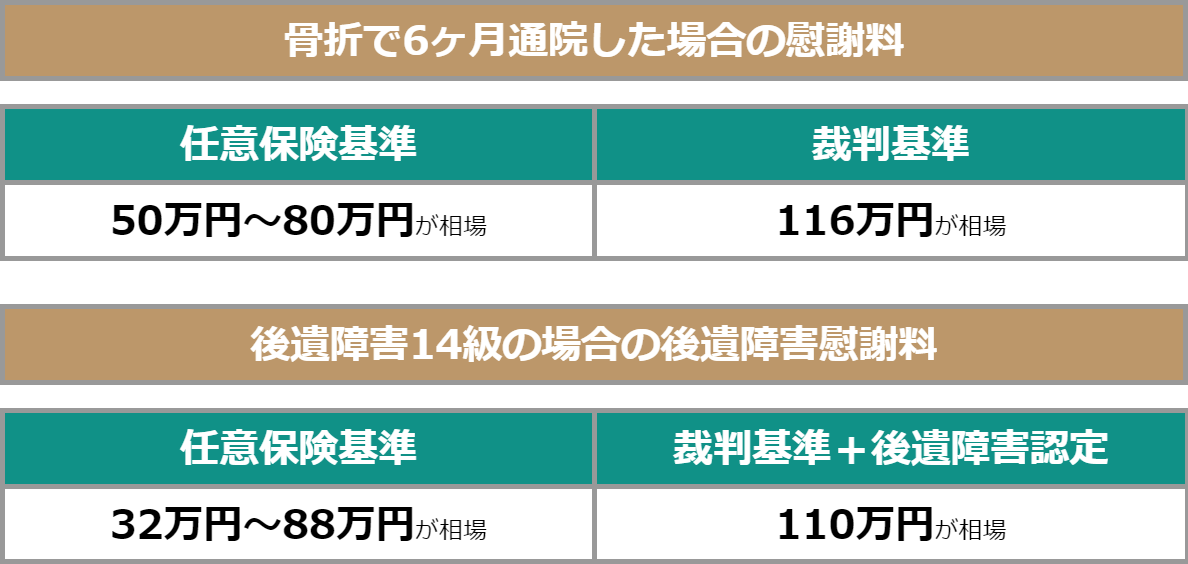 冒頭でも述べた通り、加害者の保険会社が提案してくる示談金の金額は、裁判に照らし合わせた基準よりもかなり低い金額になります。