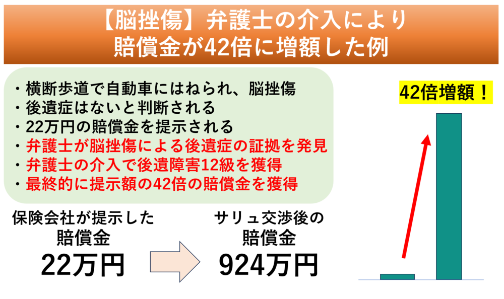 脳挫傷を負った方がサリュに相談してくださった結果、弁護士の介入で慰謝料を42倍にできたケース(事例338)がありました。