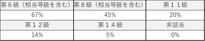 通常、労働能力喪失率は、自動車損害賠償保障法施行令(平成23年政令116号)の別表1及び別表2における後遺障害の等級によって、おおよその喪失率が定められています。圧迫骨折に関係する後遺障害等級に係る労働能力喪失率は、以下のとおりです。