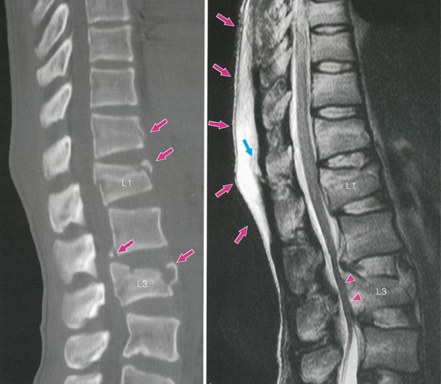 - 受傷直後のXP、CT画像上、椎体内のガスの程度を確認する