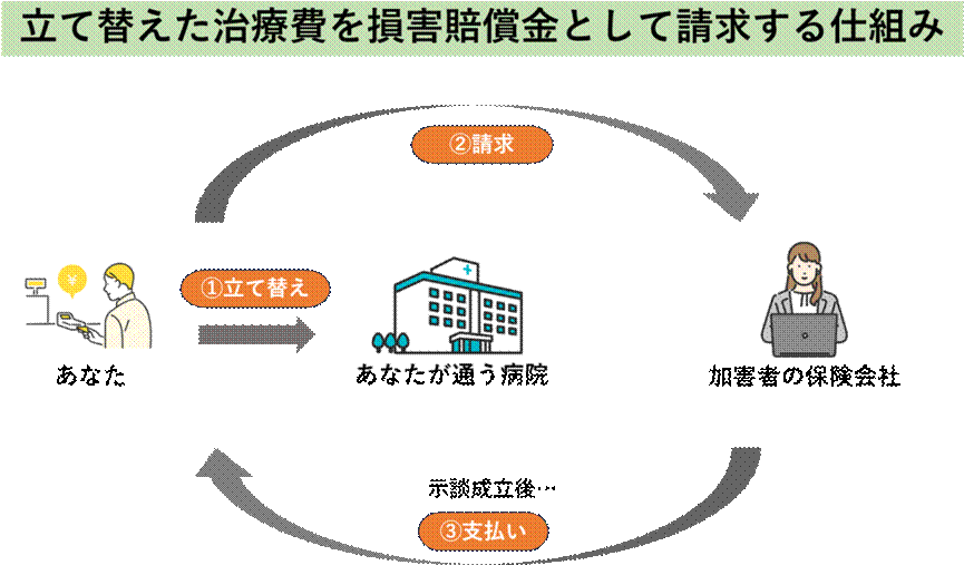 被害者がまだ治療をうけているなど、示談未了の段階では、加害者が治療費や慰謝料を含む賠償金をいくら支払うのか決まっていないため、一時的に被害者が治療費を立て替え、示談交渉時に請求する場合があるのです。