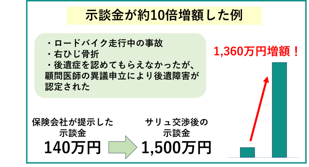 実際に弁護士法人サリュでも、被害者が実際に被った損害を計算して交渉した結果、示談金が140万円から1,500万円になった事例があります。