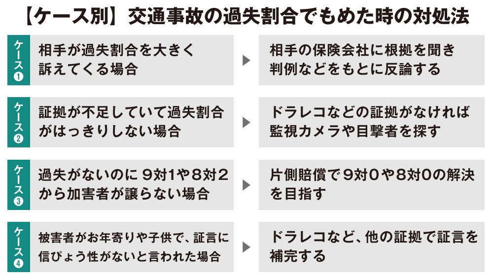 ◯交通事故の過失割合でもめたときの対処法はケースごとに下記の通り