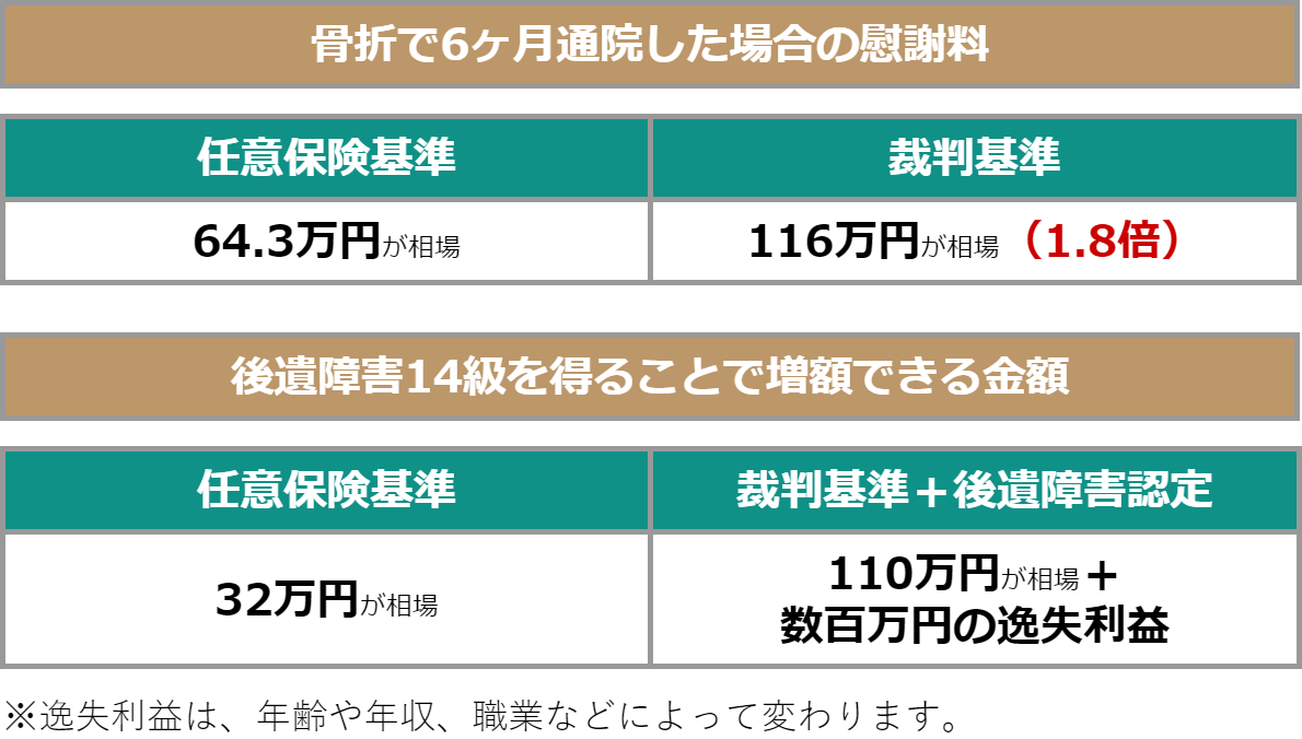 例えば、交通事故によるケガ(骨折)で6ヶ月通院した場合、加害者の保険会社から出てくる慰謝料金額は64.3万円が相場です。しかし、弁護士が入った場合の相場は116万円となります。