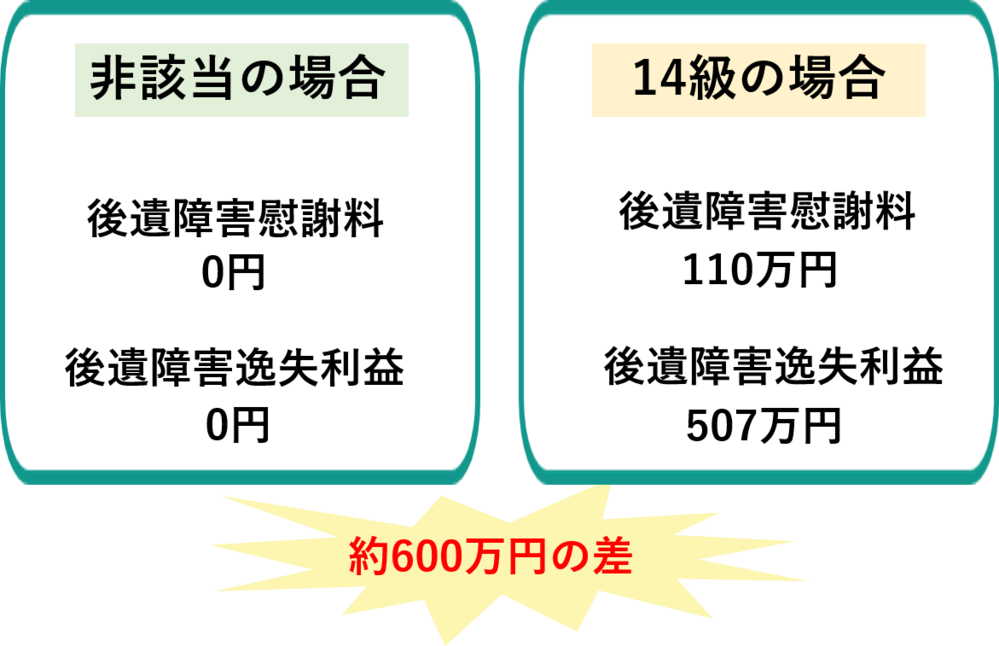 例えば、非該当の場合と14級を獲得できた場合では、後遺障害慰謝料と逸失利益だけでも600万円ほどの差が出る場合もあるのです。