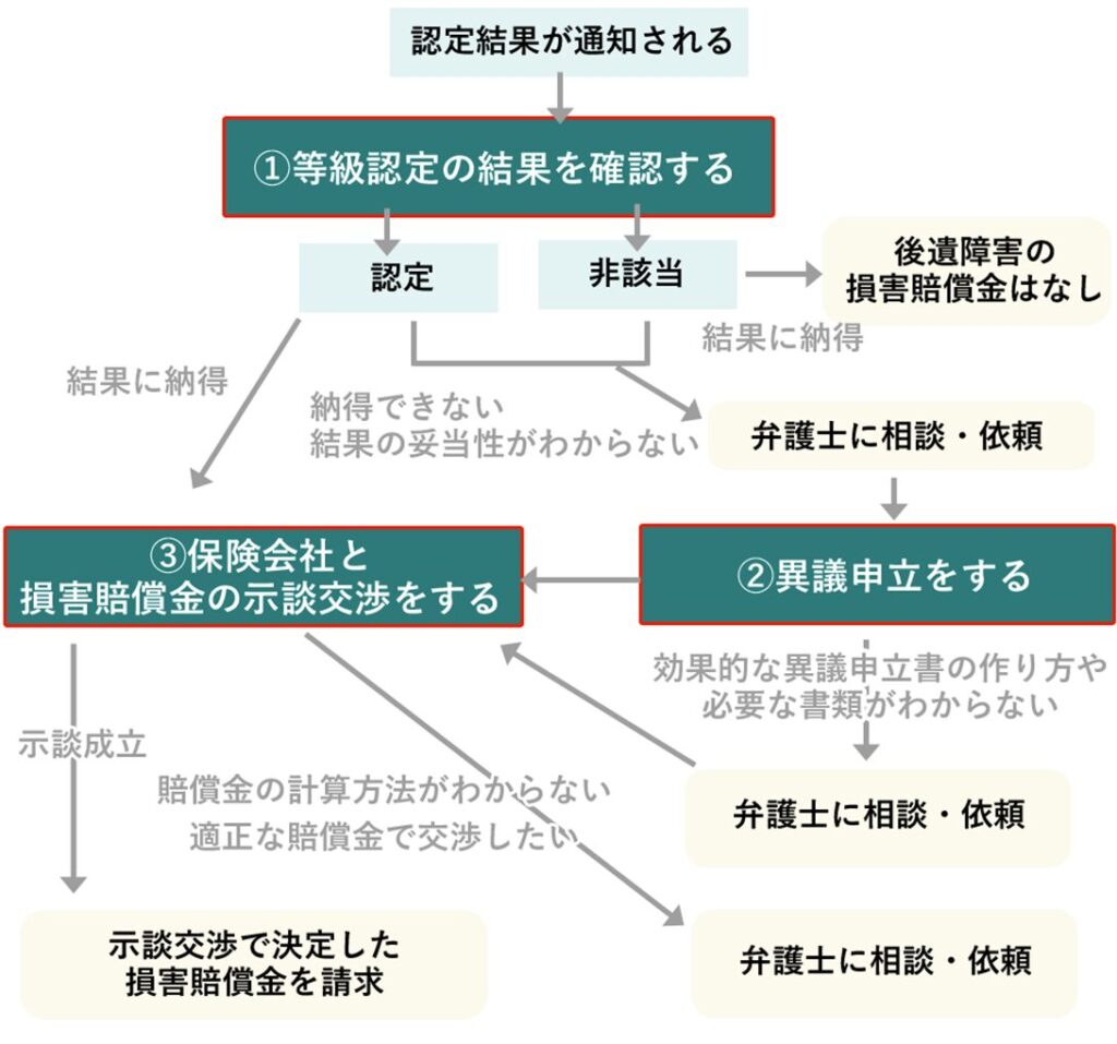 | 【まずやるべきこと】 ・等級認定結果が妥当かを確認する ・認定結果に納得できなければ異議申立をする ・保険会社と損害賠償金の示談交渉をする 【被害に見合った損害賠償金を請求するコツ】 ・主治医や保険会社の担当者を信用しすぎない ・異議申立をする際は医師に診断書を訂正してもらう ・慰謝料の示談交渉で「裁判基準の相場」を提示する ・異議申立・示談交渉をする際は弁護士のサポートを受ける →受け身にならず、自ら行動を起こすことが重要 |