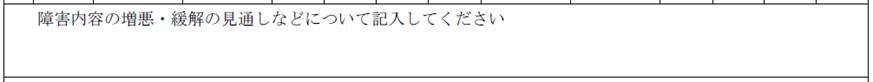 「障害内容の増悪・緩解の見通しなど」の欄には、被害者の後遺障害が今後どうなるか、医師が考える見通しを記載してもらいます。増悪とは「症状が悪化すること」、緩解とは「症状が治まること」をいいます。