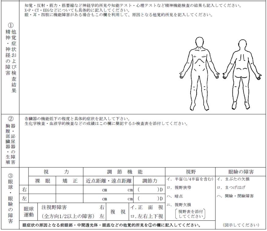 これらの欄には、神経学的検査(手足の運動麻痺や感覚障害の有無などを調べる検査)、画像検査(レントゲン・CT・MRIなど)、脳波検査、知能テスト・心理テストなど精神機能検査、医師による触診・視診の結果などを記載してもらいます。