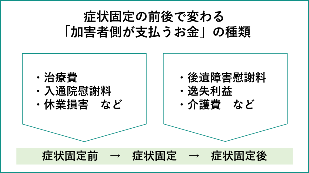 実は、症状固定の時期を境目に、加害者側が支払うお金の種類が変わります。