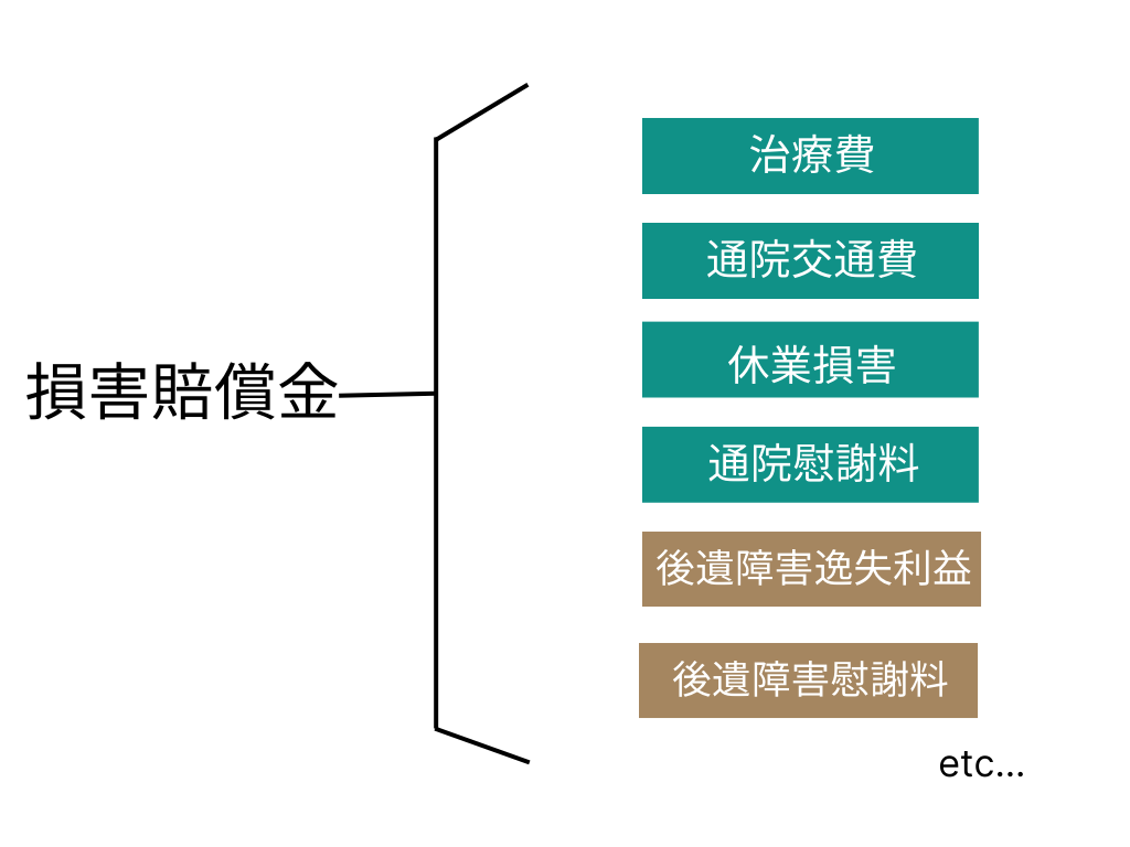 と思われている方もいらっしゃいますが、慰謝料はあくまで、休業損害や治療費同様、他の損害賠償項目の一つです。