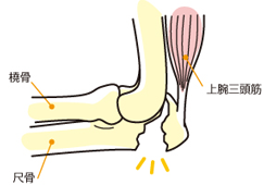 肘頭とは、尺骨(前腕部の小指側の骨)の上頭部のことで、この部分を骨折することです。肘頭部へ直接外力が加わった場合や、肘の屈曲時に上腕三頭筋の筋力により骨の一部が裂離して生じます。事後に変形性肘関節症を生じることもあります。
