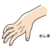 尺骨神経は、頸神経8番及び胸神経1番から伸びる母指球筋(親指の付け根のふくらみ部)以外の手指の屈筋を支配する神経です。楽器演奏で重要な小指側の筋肉を支配するので、別名音楽家の神経とも呼ばれます。この神経に損傷・圧迫等があると、MP関節(指の付け根の関節)の過伸展とIP関節(指の関節)屈曲が起こり、鷲の爪のような鷲手(わして)が出現します。肘部菅症候群、上腕顆上骨折、腕骨内上顆骨折、変形性肘関節症などで生じることがあります。
